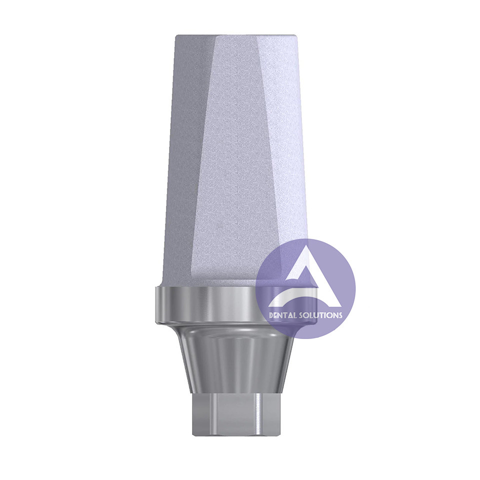 Titanyum dayanaklardüz ve açılı (15°) versiyon olarak eğimli bir yakayla tasarlanmıştır. Eğimli yakasının açısı ve en düşük noktası, iç altıgen indeksleme özelliğinin düz taraflarından biriyle ilişkilendirilerek işlenir. Her bir dayanak, eksiksiz bir kit oluşturmak için son vida ile paketlenir. NP (3,5 mm) ve RP/WP (4,3/4,9 mm) platform dayanakları, iki düz (Şekil 1, üst sıra) 1,5 mm veya 3 mm yaka ve iki açılı (Şekil 1, alt sıra) 1,5 mm veya 3 mm yaka olmak üzere dört versiyonda üretilir. Dayanakların hiçbiri platform çapını belirlemek için renk kodlu veya başka bir şekilde işaretlenmemiştir.